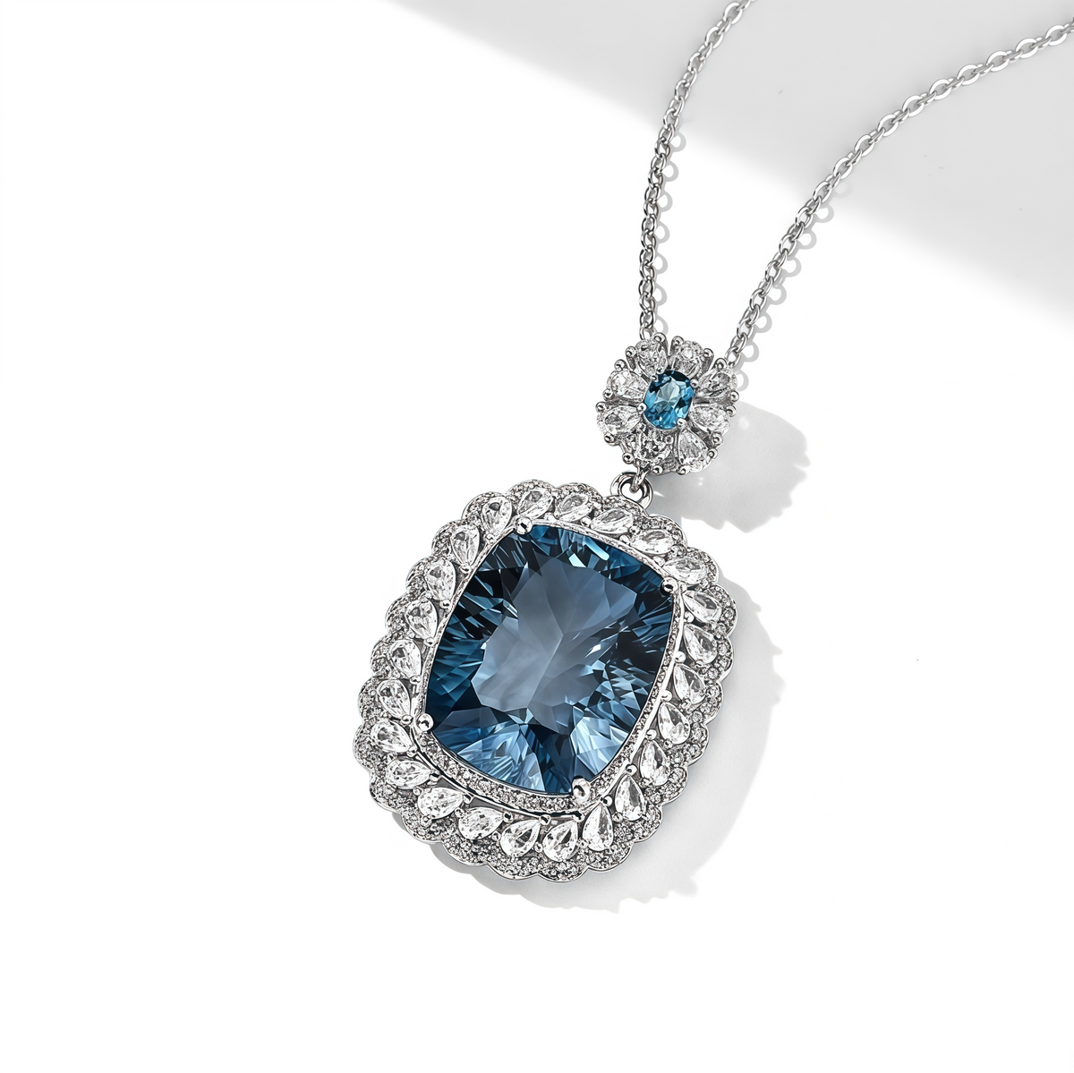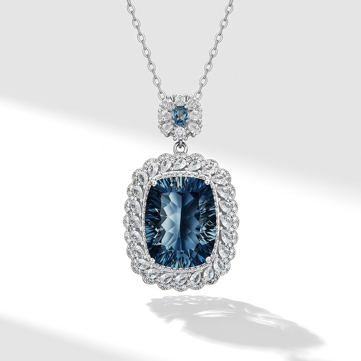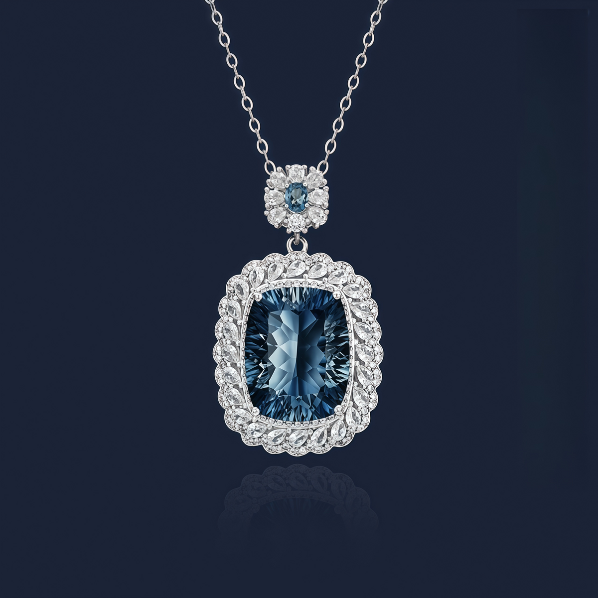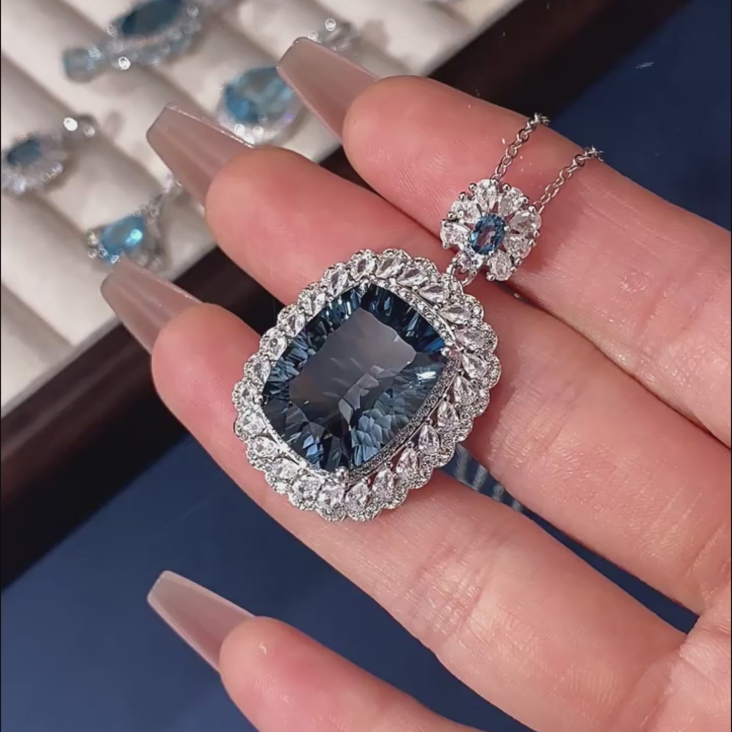 This necklace is inspired by the heart of the deep sea. The cushion-cut main stone resembles a blue crystal core born from the depths of the ocean, with a full yet clean silhouette and a clear, transparent color, exuding a calm and profound oceanic aura. The unique soft curves and sharp angles of the cushion cut balance each other, giving the gemstone a stronger sense of three-dimensionality and light and shadow effects.