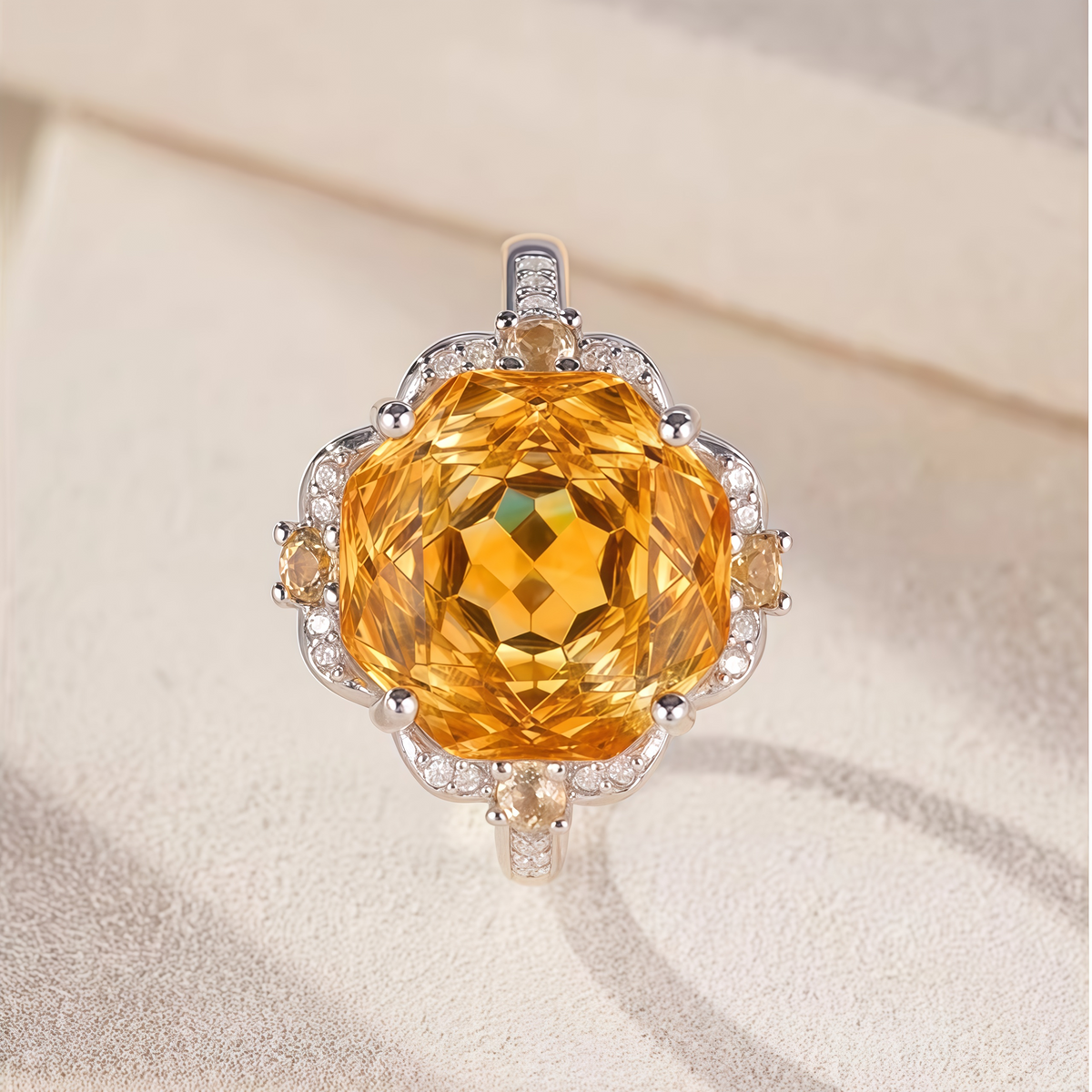 This ring features a full and dazzling golden-yellow main stone as its visual centerpiece, its color warm and bright like afternoon sunlight, symbolizing wealth, hope, and positive energy.